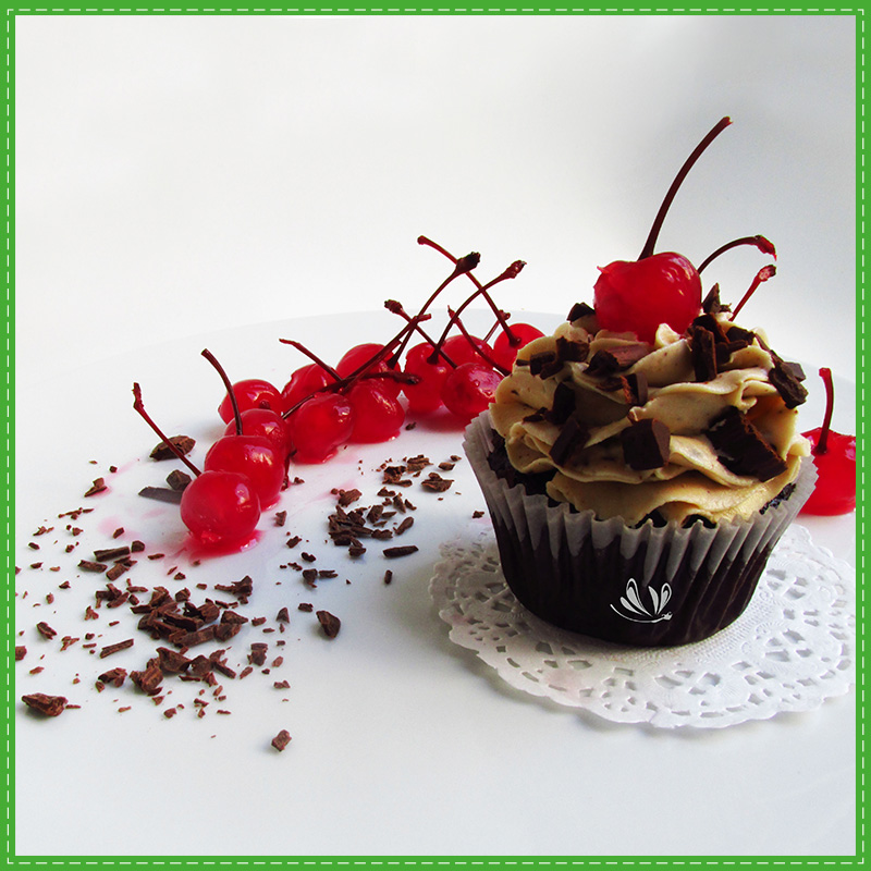 Rico y esponjocito keke de chocolate relleno de fudge con trocitos de cerezas marrasquino cubierto de crema chantilly decorado con media cereza encima.